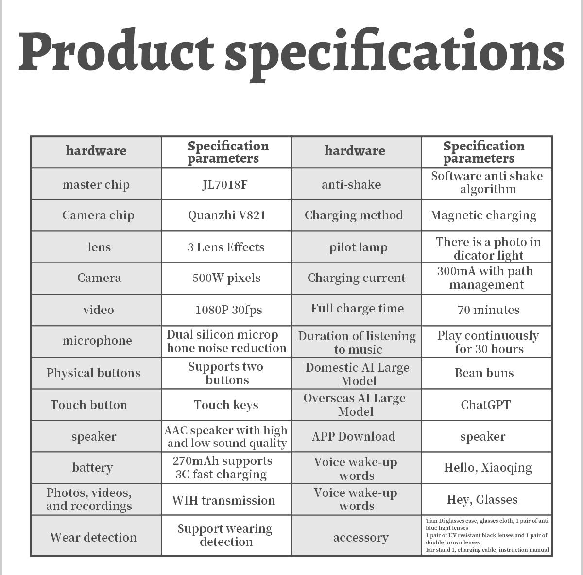AI photo recognition answers, photography, video, recording, AI dialogue intelligent interaction, Bluetooth calls, local music, music playback (switching, pausing music appreciation), low-power JL7018F main control chip, long-lasting battery life, convenient operation of dual physical buttons + dual touch buttons, comfortable wearing of 35g lightweight machine weight, configurable sunglasses, blue light and other lenses, 270MA large battery, ultra-low power consumption (supports continuous recording for more than 2 hours without heating), connect to ChatGPT's advanced model, high image recognition ability and high accuracy