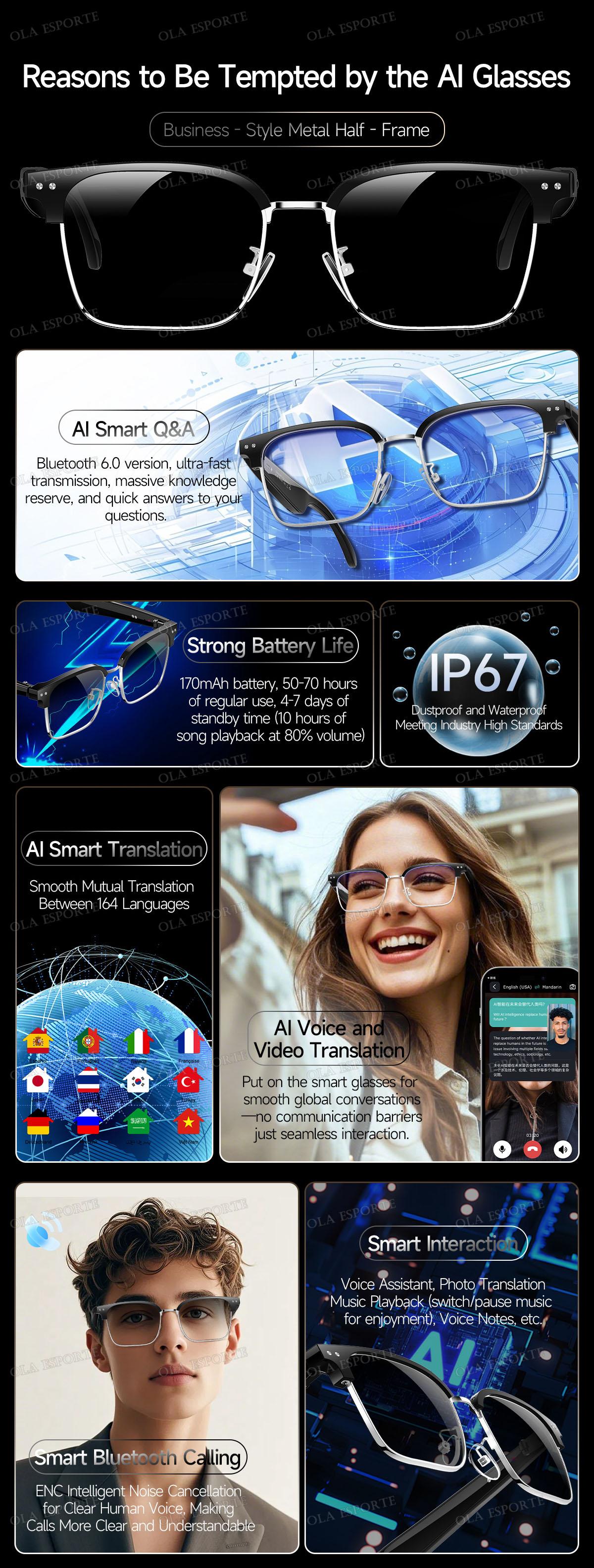 AI Smart Translation Glasses Bluetooth Call Remote Music 163 Video Online Language Translator Voice Note UV400 Sunglasses 2025